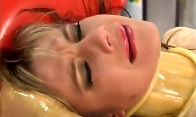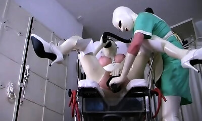 blonde latex nurse investigates her blond patient with enema, speculum and suction bowls